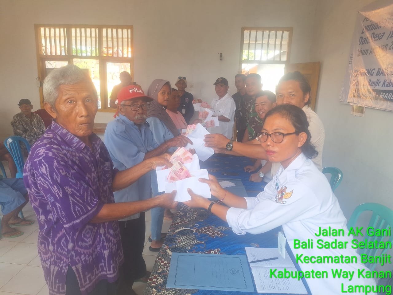Waykanan – Pemerintah Kampung Bali Sadhar Selatan merealisasikan Bantuan Langsung Tunai (BLT) bersumber dari Dana Desa Tahun Anggaran 2025 kepada 12 Kelompok Penerima Manfaat (KPM) yang di laksanakan di Balai Kampung setempat, Kamis 29 Mei 2025.